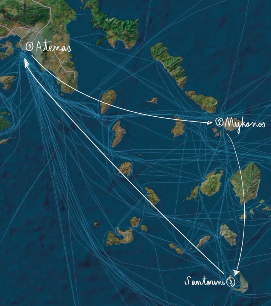 Como nuestro vuelo era ida y vuelta a Atenas, hicimos una ruta circular. Comenzamos visitando Atenas, de ahí pasamos a Mykonos, continuamos con Santorini y regresamos a Atenas la última noche para coger nuestro vuelo de regreso.