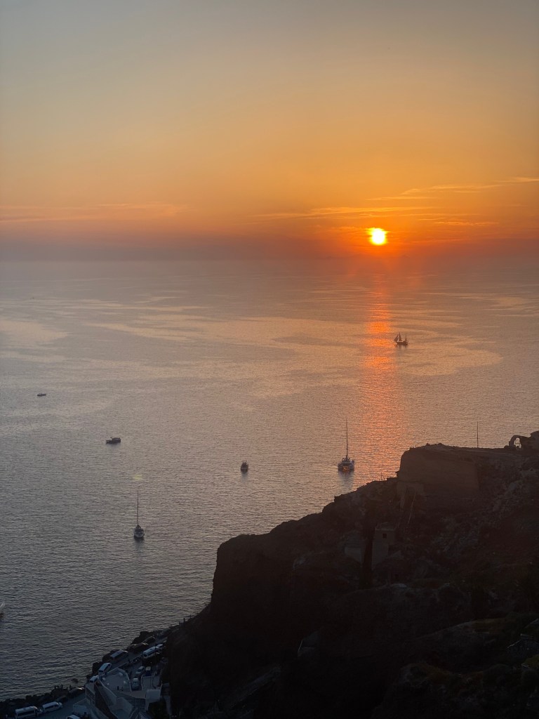 Santorini es una isla diferente a Mykonos ya que tiene mayor altitud y a penas tiene ubicaciones a nivel del mar sino que son mayormente acantilados, así que las vistas son más «dramáticas» y espectaculares.