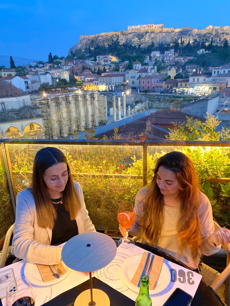Tras dejar nuestras cosas en el apartamento, fuimos a dar un paseo y cenamos en 360 Cocktail Bar. Te recomiendo que reserves con antelación y llames para pedir las mesas más cercanas a la acrópolis porque las vistas son increíbles!!