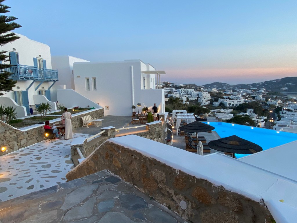 Ojalá podernos alojar algún día en este hotel pero los precios son prohibitivos, así que de momento nos conformamos con haber podido disfrutar de sus vistas y te recomiendo totalmente que hagas lo mismo porque son las más bonitas que tuvimos en nuestra estancia en Mykonos.